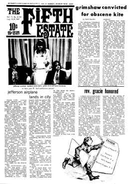 Fifth Estate Issue #34, July 15-31, 1967 WEB CONTENTS Grimshaw Convicted for Obscene Kite Jefferson Airplane Lands in City Rev. Gracie to be Honored Lawyers for LEMAR? The Press of Peace Trans-Love Closes “See” Eye Witness Report Police Riot Fort Hood Three Has Prison Terms Lowered Fug Ed Sanders Not Obscene The Coat Puller Old Angels Never Die LBJ Signs New Slave Law The Diary of Anais Nin Crime Man Off Center The MC-5 We Won’t Go! The Great Comic Convention Letters To The Editors Calendar Mime Troupe on Tour: Due Here Unclassified Ads ALL FIFTH ESTATE ISSUES FIFTH ESTATE HOME